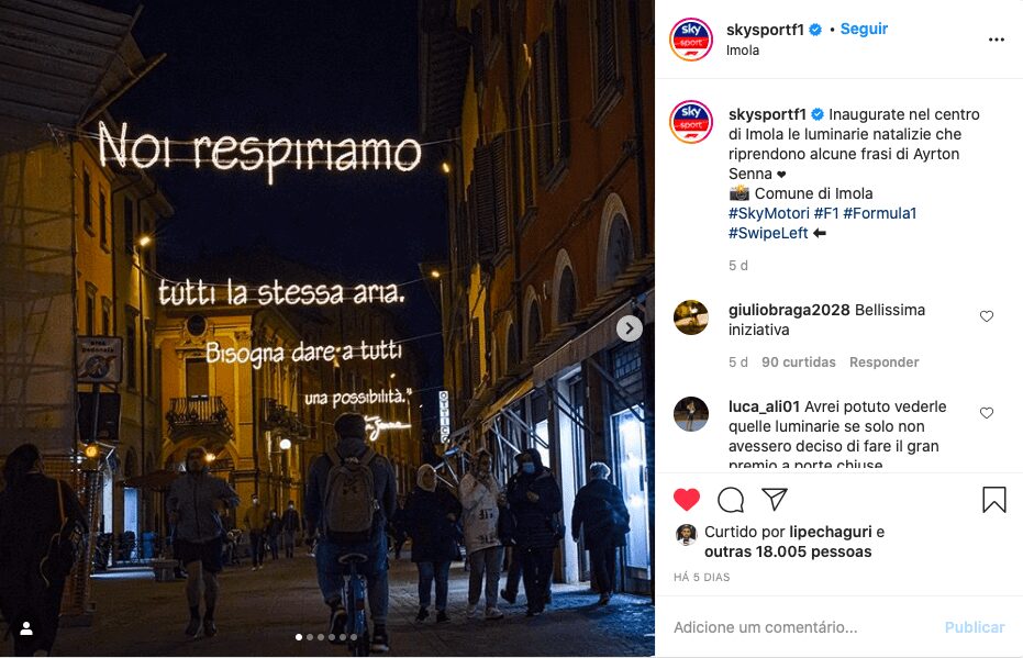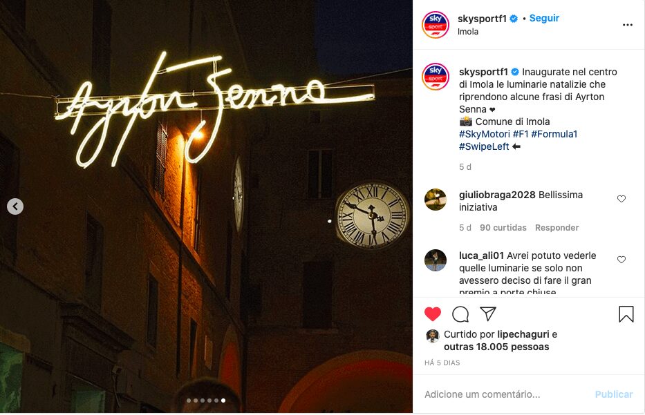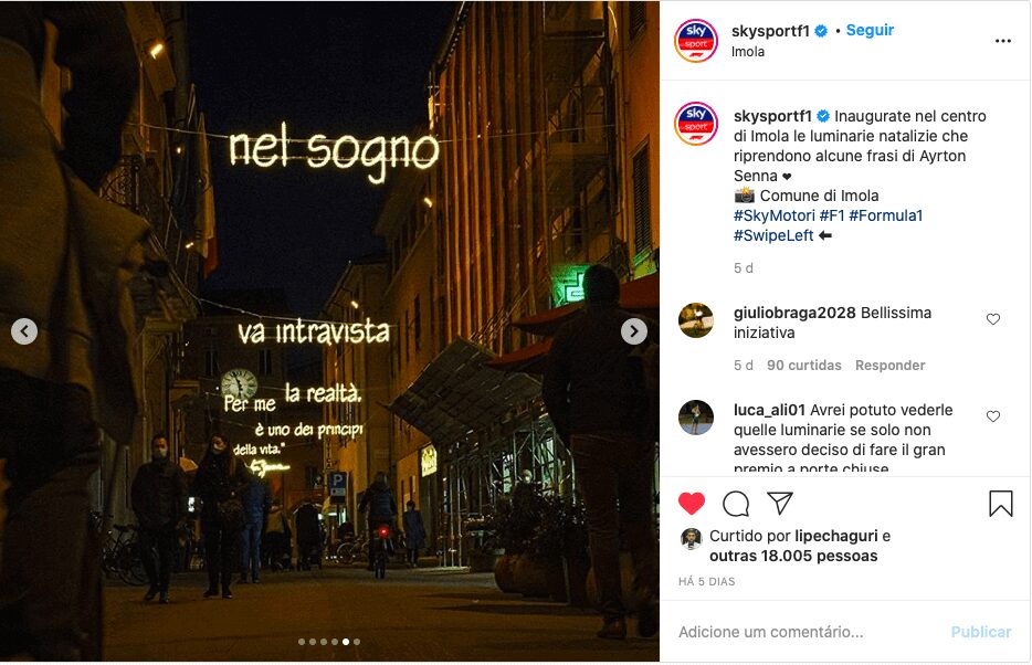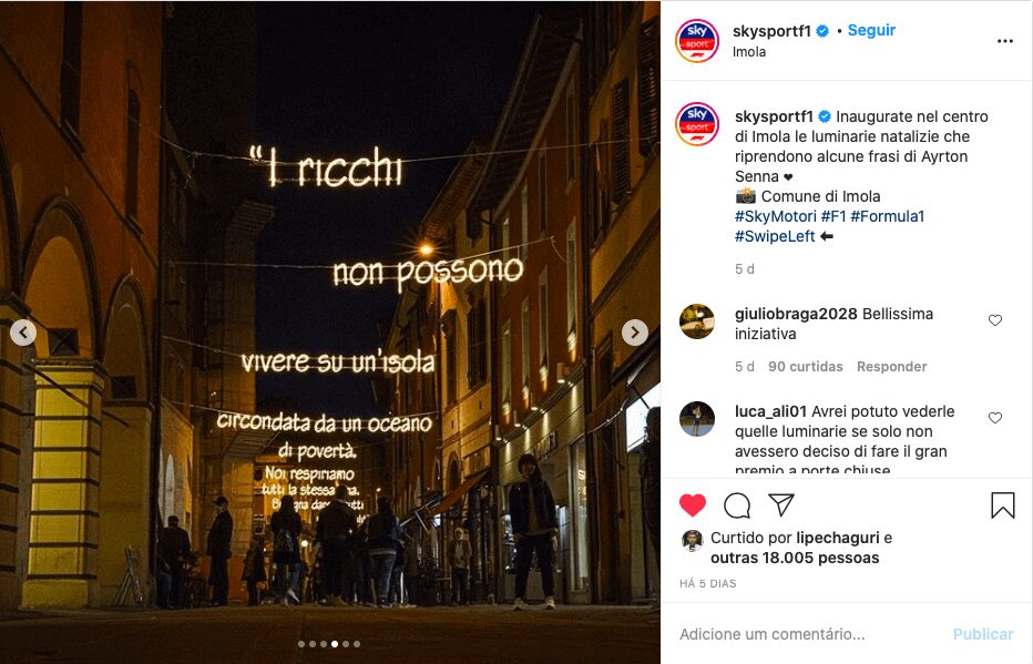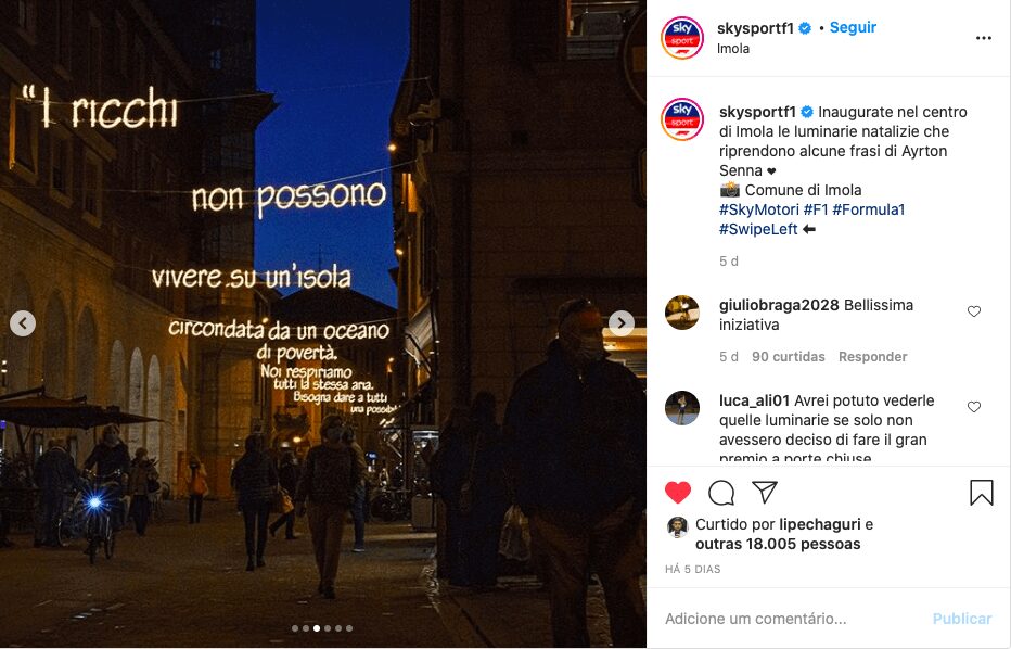Uma homenagem especial também foi colocada no centro da cidade de Ímola, com luzes de Natal relembrando frases de Senna que representam o legado que o piloto de F1 deixou para o mundo com sua carreira recheada de conquistas em paralelo com seu lado humano e filantrópico.