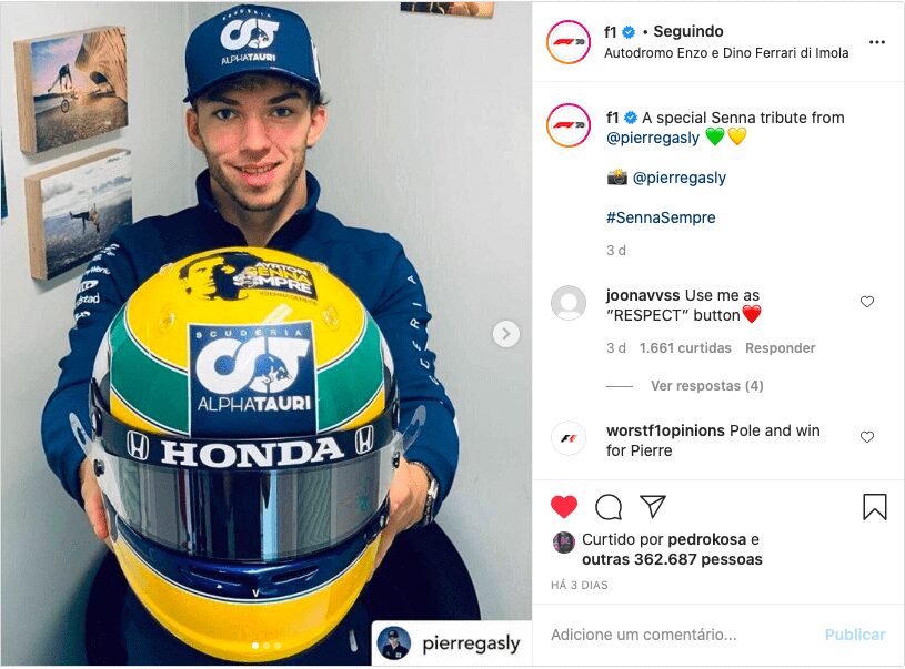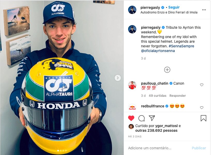 O final de semana do Grande Prêmio da Emilia-Romagna de Fórmula 1 disputado em Ímola, na Itália, ficou marcado por diversas homenagens a Ayrton Senna. A mais icônica delas foi feita pelo francês Pierre Gasly, piloto da Alpha Tauri, que estilizou seu capacete com uma pintura semelhante a do tricampeão mundial de F1.
