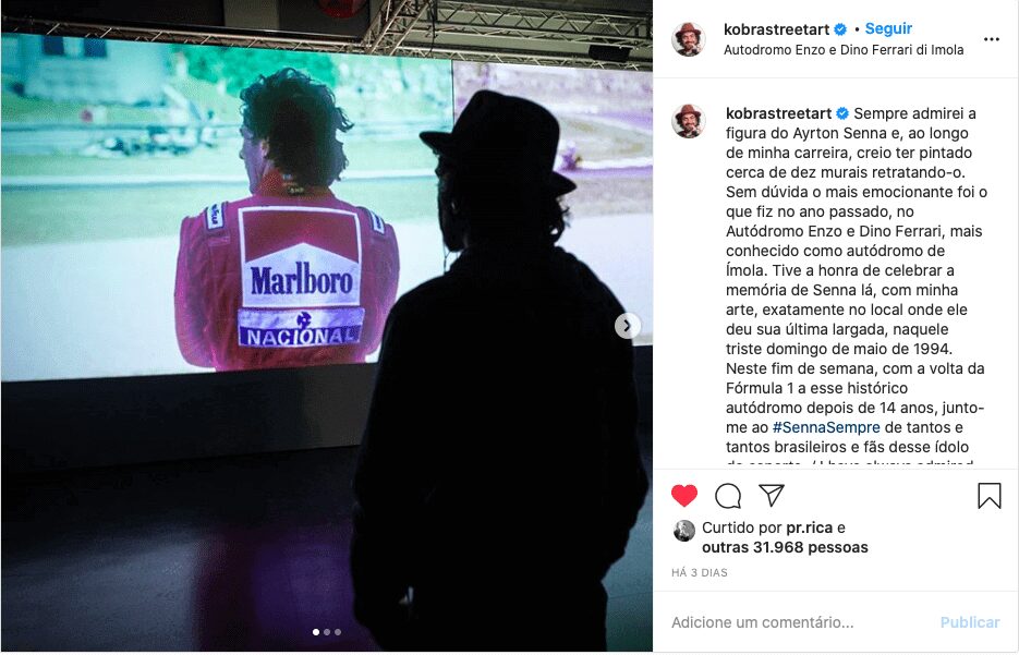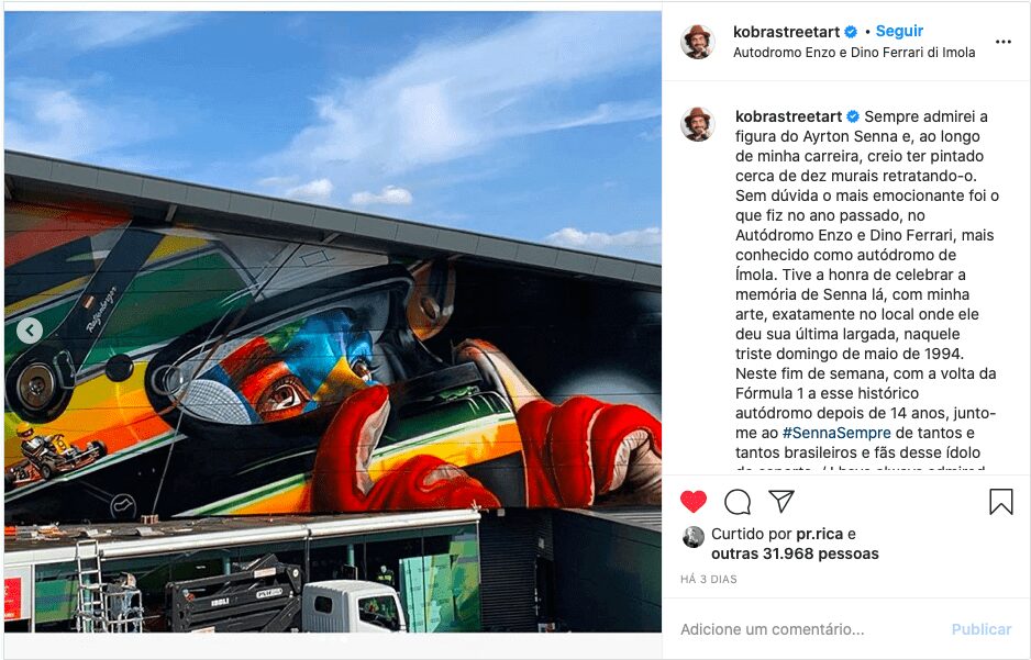 Além do memorial, o circuito de Ímola ainda tem um mural especial pintado pelo artista Eduardo Kobra com imagem de Senna usando seu capacete e no canto da pintura é possível ver o próprio Ayrton guiando um kart. Esse mural fica sobre a entrada do museu do autódromo e Kobra, inclusive, publicou uma foto desta sua homenagem neste final de semana.