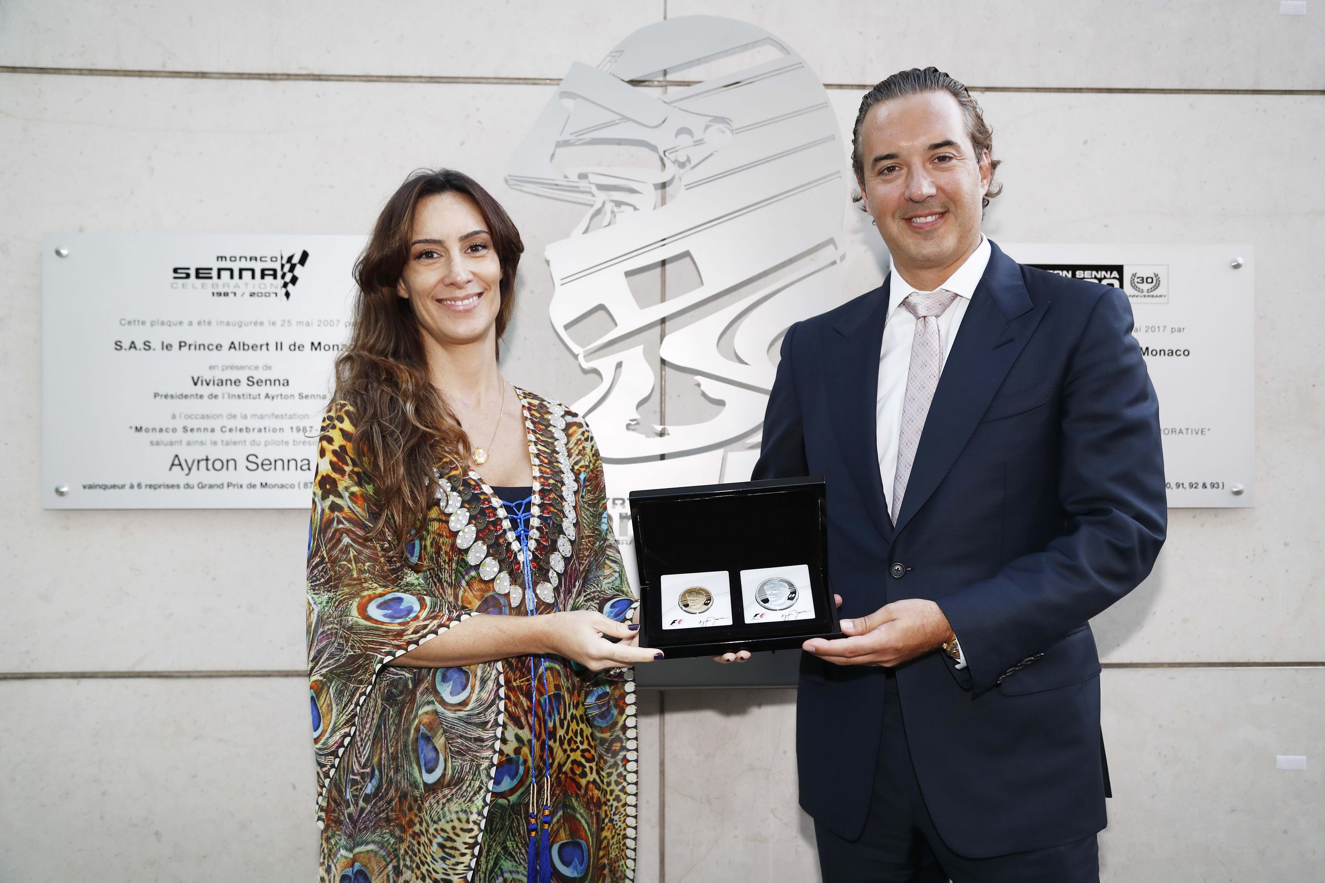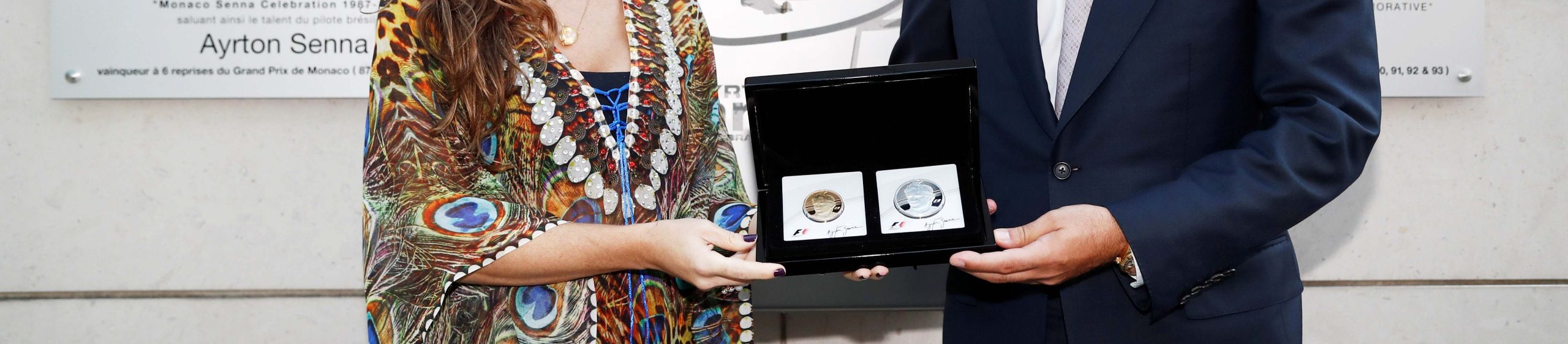 O CEO da Rosland Capital, Marin Aleksov, apresentou as moedas de ouro e prata à Diretora do Instituto e sobrinha de Ayrton, Bianca Senna, logo após a inauguração de uma estátua comemorativa em homenagem ao tricampeão Mundial de F-1, que foi revelada pelo Príncipe Albert II de Mônaco, no Hotel Fairmont, em Monte Carlo, durante o fim de semana do Grande Prêmio.