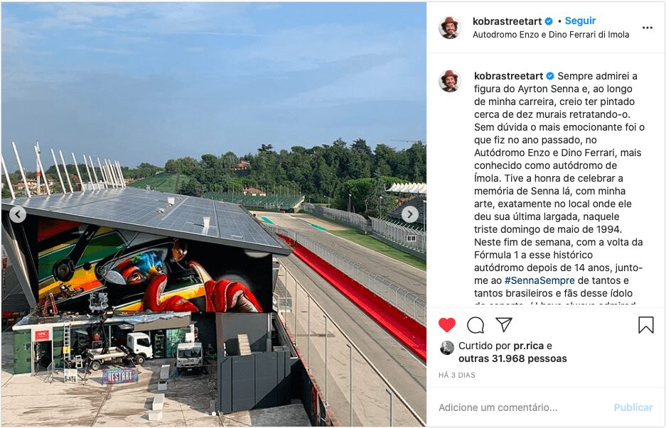 In addition to the memorial, the Imola circuit also has a special mural painted by the artist Eduardo Kobra with an image of Senna wearing his helmet and in the corner of the painting it is possible to see Ayrton himself driving a kart. This mural is over the entrance to the race track museum and Kobra even published a photo of this tribute this weekend.