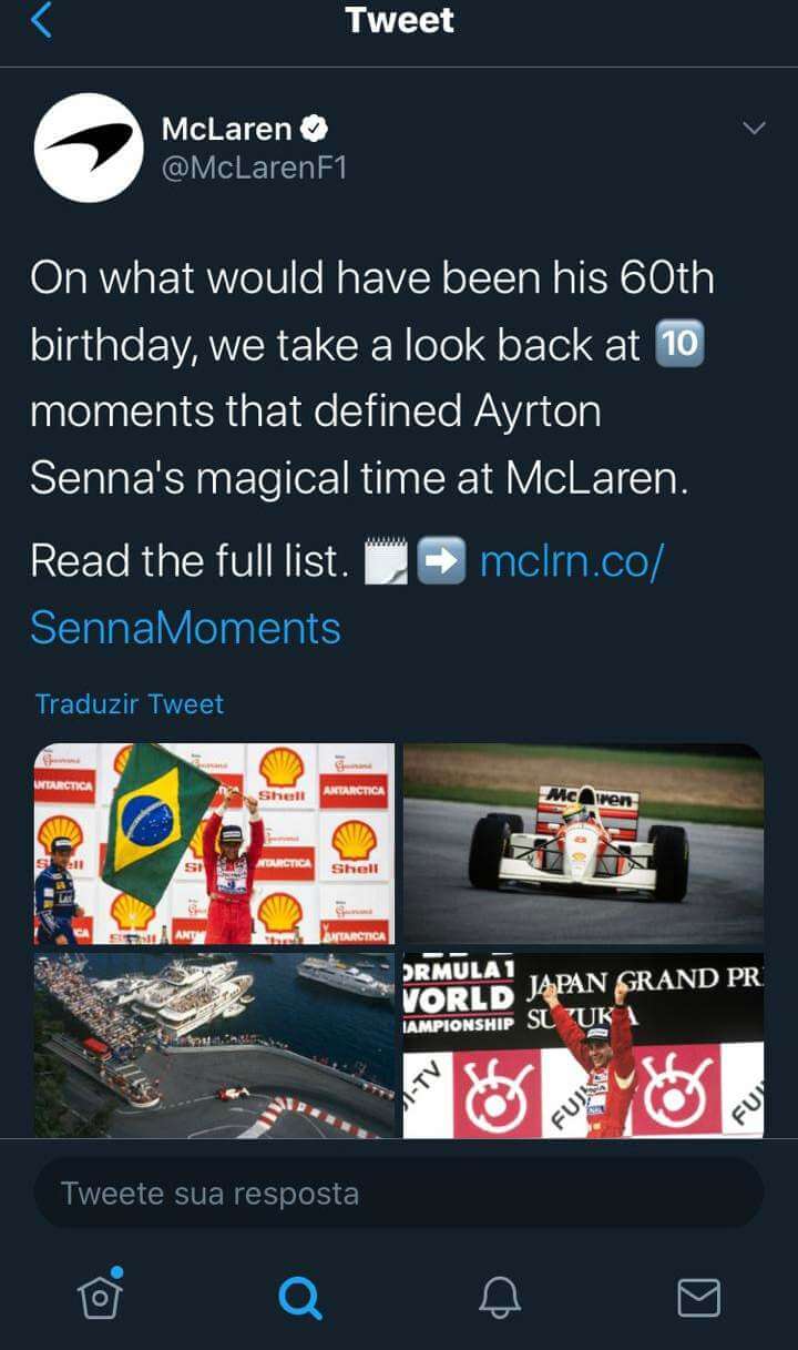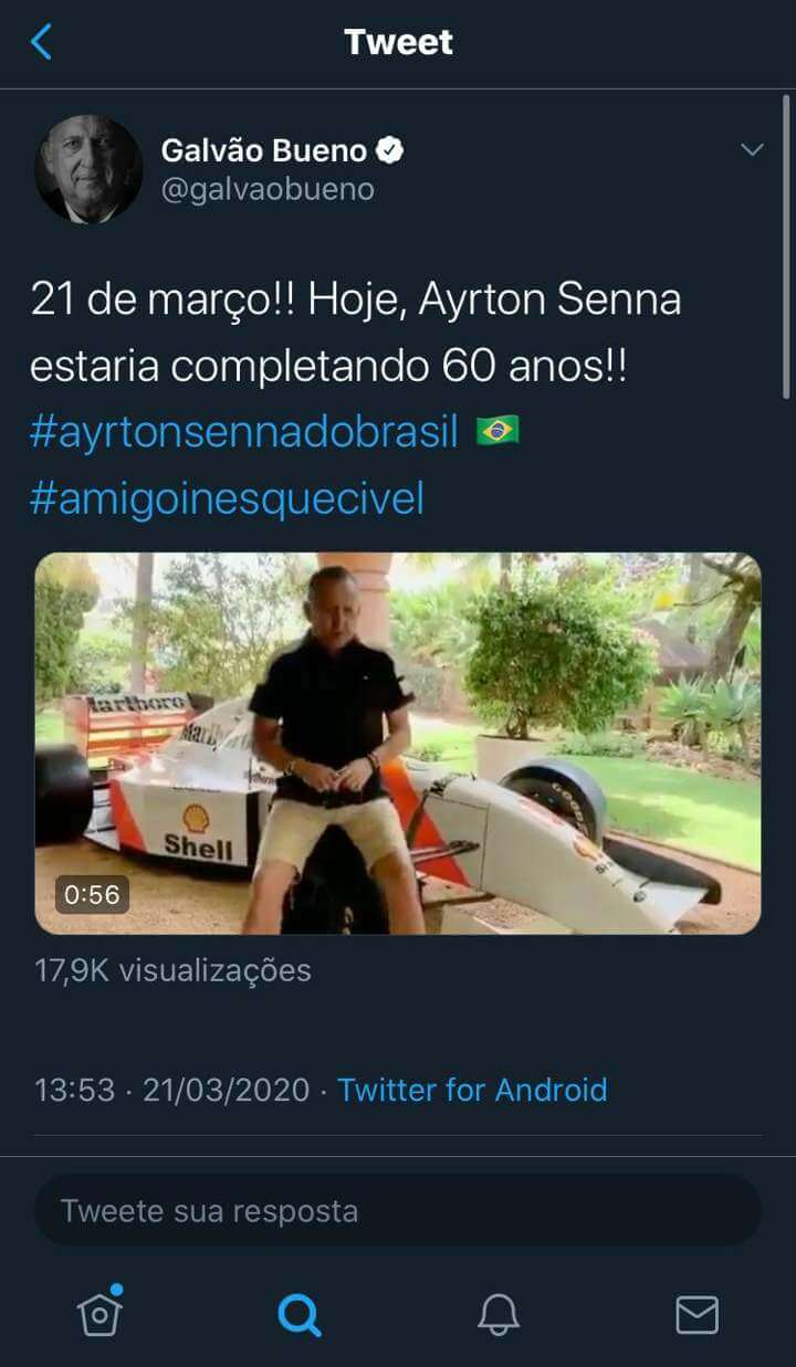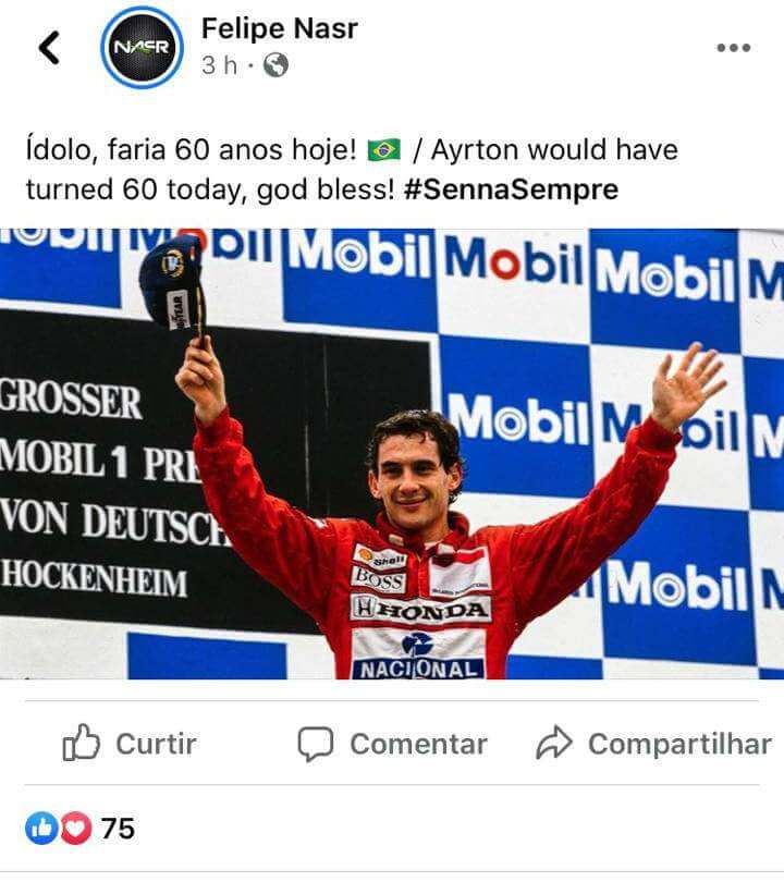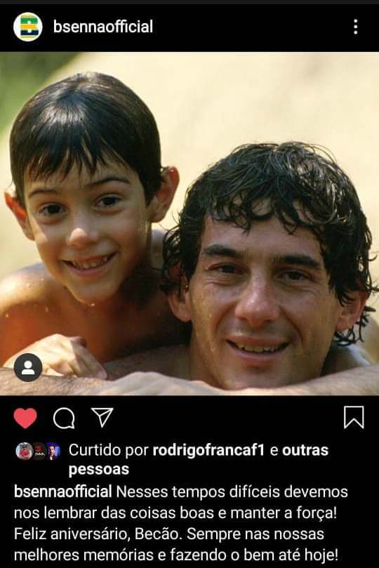Several F1 former drivers made posts in honor of Ayrton Senna, such as Alain Prost, Rubens Barrichello, Felipe Nasr, Antonio Pizzonia, Felipe Massa, Martin Brundle and Lucas di Grassi – besides, of course, his nephew, Bruno Senna. Teams McLaren and Williams also paid tribute to Senna, and the official F1 profile did the same.