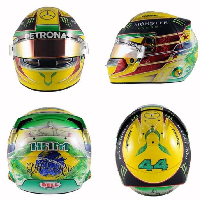 O capacete de Lewis Hamilton terá as cores icônicas (verde, amarelo e azul) de Ayrton Senna para o GP do Brasil, que será realizado neste domingo (13) em Interlagos. O piloto inglês, fã declarado do brasileiro, terá seu casco personalizado para a penúltima etapa do campeonato de 2016 e divulgou nesta quinta-feira em suas redes sociais o novo capacete.