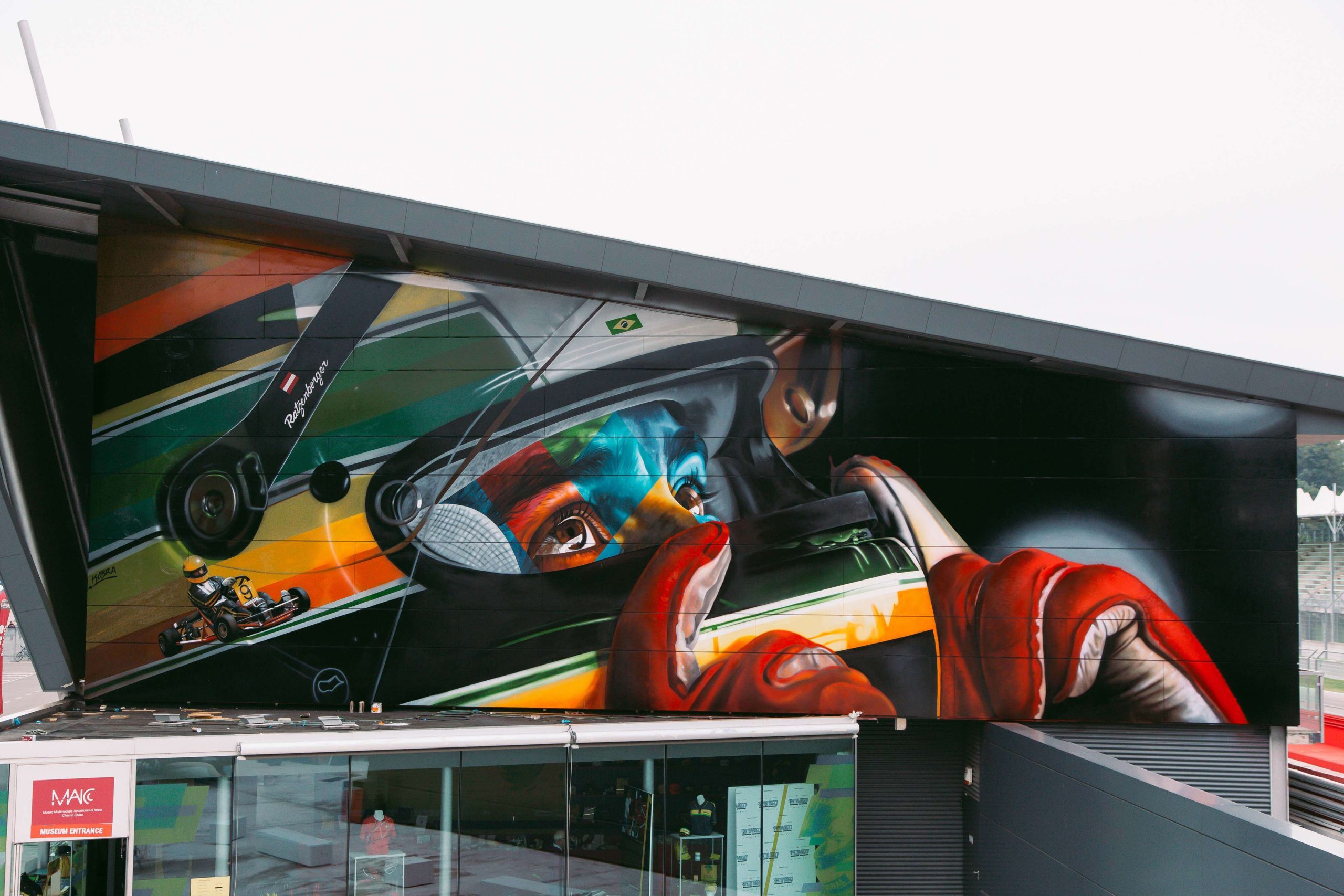 O mural em Ímola foi lançado, com 21 metros de comprimento por sete de altura, em setembro de 2019. O autódromo italiano foi o palco da fatalidade com o piloto brasileiro em 1º de maio de 1994, mas também um cenário de recordes e conquistas de Ayrton, que permanece até hoje como o recordista de poles em San Marino na F1 (8 no total), além de ter obtido três vitórias no local (1988, 1989 e 1991). A obra fica na fachada do museu Checco Costa, no lado interno do autódromo.